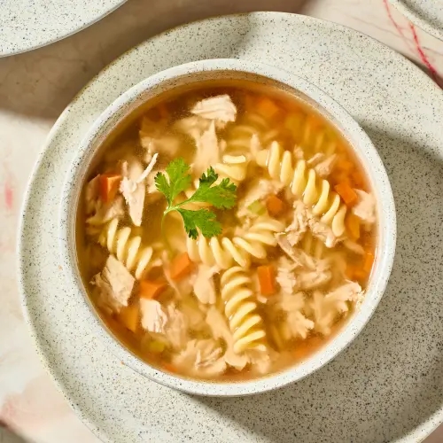 Chicken broth, shredded chicken, fusilli, carrots, celery and cilantro.