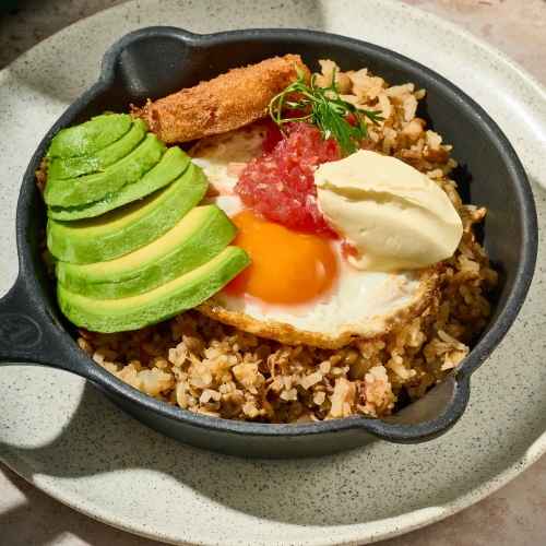 Huevos fritos, carne desmechada, arroz blanco, lentejas, tomate picado con aceite de oliva, crema agria, aguacate, cilantro y papa hashbrown.